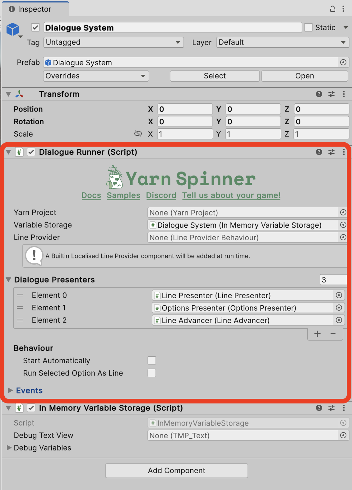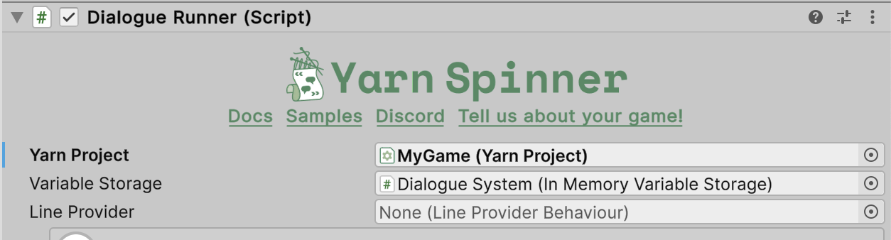 If you don’t set a Line Provider, the system will create a Text Line Provider automatically. These components are all configured in the Dialogue Runner: