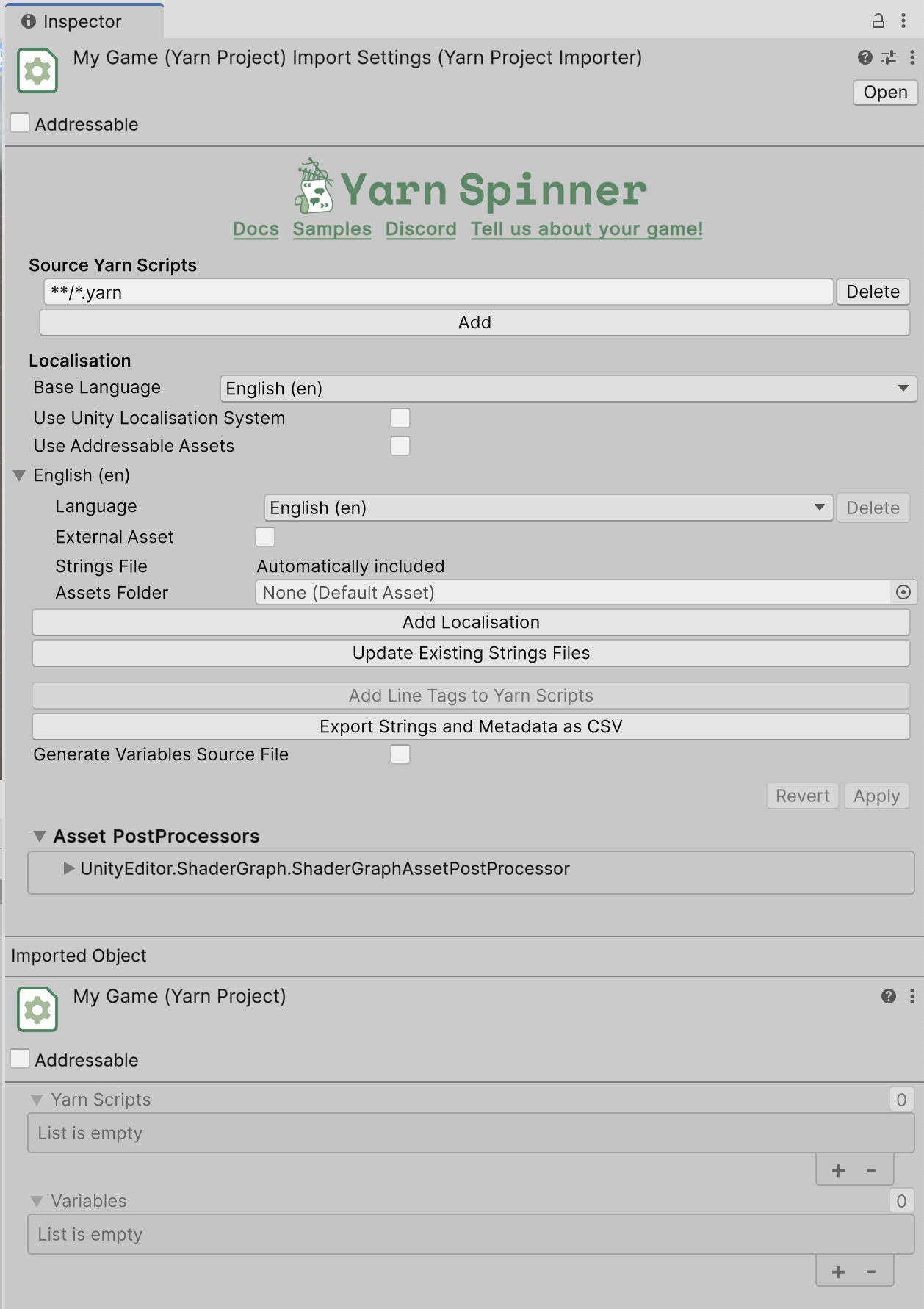 You’ll notice that it’s including all .yarn scripts in the same folder as it, or in folders below/inside it. You can change this, or add specific Yarn Spinner Scripts if you’d like. You can also use this Inspector to change the default language for your Yarn Spinner Project, add additional localisations, and export your strings for translation.