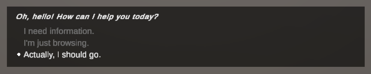Here’s a simple example of dialogue written in Yarn: