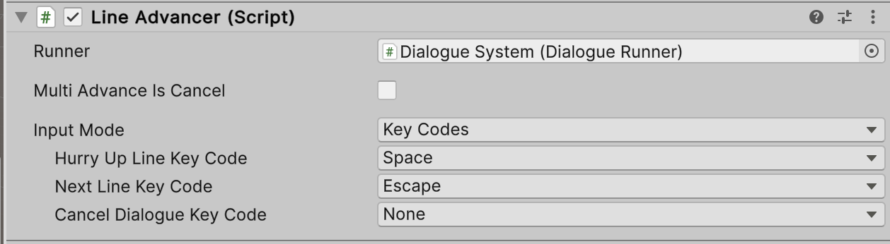 The Line Advancer allows players to progress dialogue using input. You can configure it by: