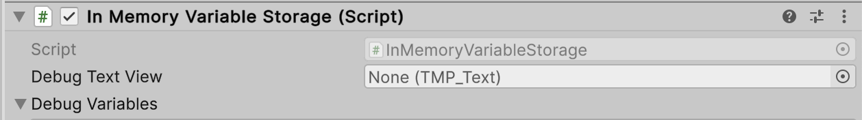 To debug variables during development, use the Debug Text View property of the In-Memory Variable Storage component. By creating a TextMeshPro Text Component in your Hierarchy, and assigning it to the Debut Text View field of the In Memory Variable Storage component attached to the Dialogue System, you can monitor variables in your game view for debug purposes: