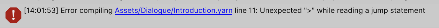 The Unity console showing that we forgot to close a Yarn Command on line 11 of the Yarn Script.